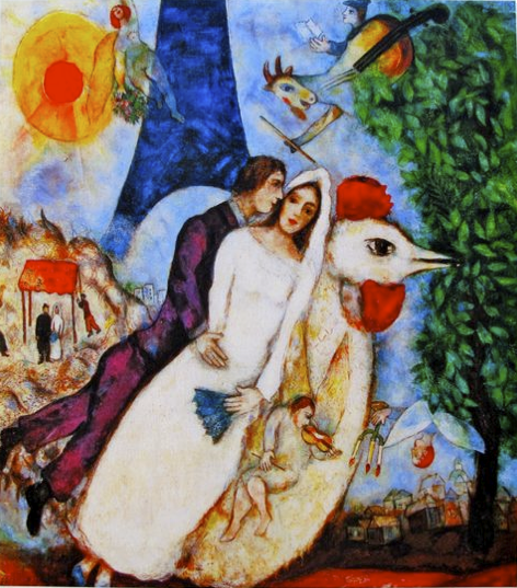 The suns, the fiddles, the wedded couple and the Eiffel Tower--Chagall understood that love is a gentle dance played by fiddlers under the glow of two suns. He knew that upon a rooster's back, a perspective is gained of the heaven and skies that only a couple with courage to fly can see. And, perhaps, he knew, instinctively or not, that marriage, and the duration of it, is the eighth wonder of the modern world.